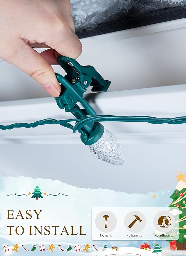 - Convenient Firm Setup and Removeable Quick Clips: These energy efficient C9 LED Christmas lights feature spring-loaded clips that provide a convenient and firm setup. Compared with ordinary clips, the spring-loaded clips can more firmly and securely fastening the lights to various surfaces such as roofs, railings, or trees. The clips can also be easily removed if needed. Perfect for outdoor and indoor use