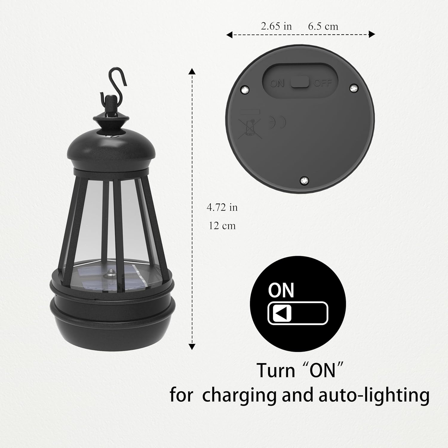- Portable Size & Solar charging: 8.7"×3.1"×9.5". For the first use, turn the switch to “ON”, simply leave it charging in the sun (in case the energy runs out after a long period of time out of the sun during transportation), and it will automatically light up at dusk.