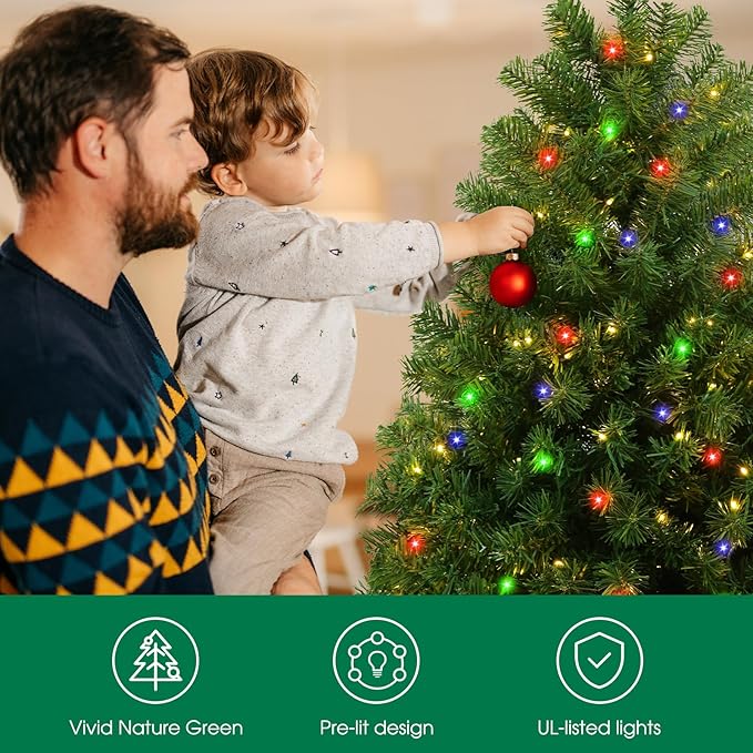 - 【7.5 ft Pri-lit Christmas Tree】 It stands at a height of 7.5 feet, boasts 1346 branches, It's an excellent choice for both spacious living rooms and cozier settings. Adding to its charm are 450 multicolor RGB lights that infuse a cozy holiday ambiance. With 8 lighting modes to choose from, you can effortlessly customize the tree's glow to suit different occasions and moods, whether you prefer a steady radiance or a twinkling, dynamic display.