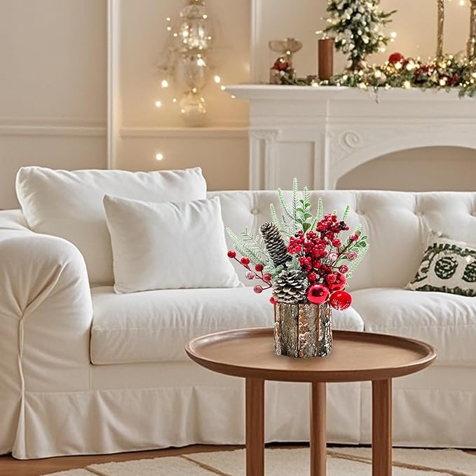 - Compact and Adorable Design: This small Tabletop Christmas tree is a perfect addition to your workspace or any small area. Its charming and compact size makes it ideal for those who want a touch of holiday cheer without taking up too much space. This Christmas decorations features a classic and elegant design, green foliage and berries, pine cones will bring the festive spirit to your surroundings
