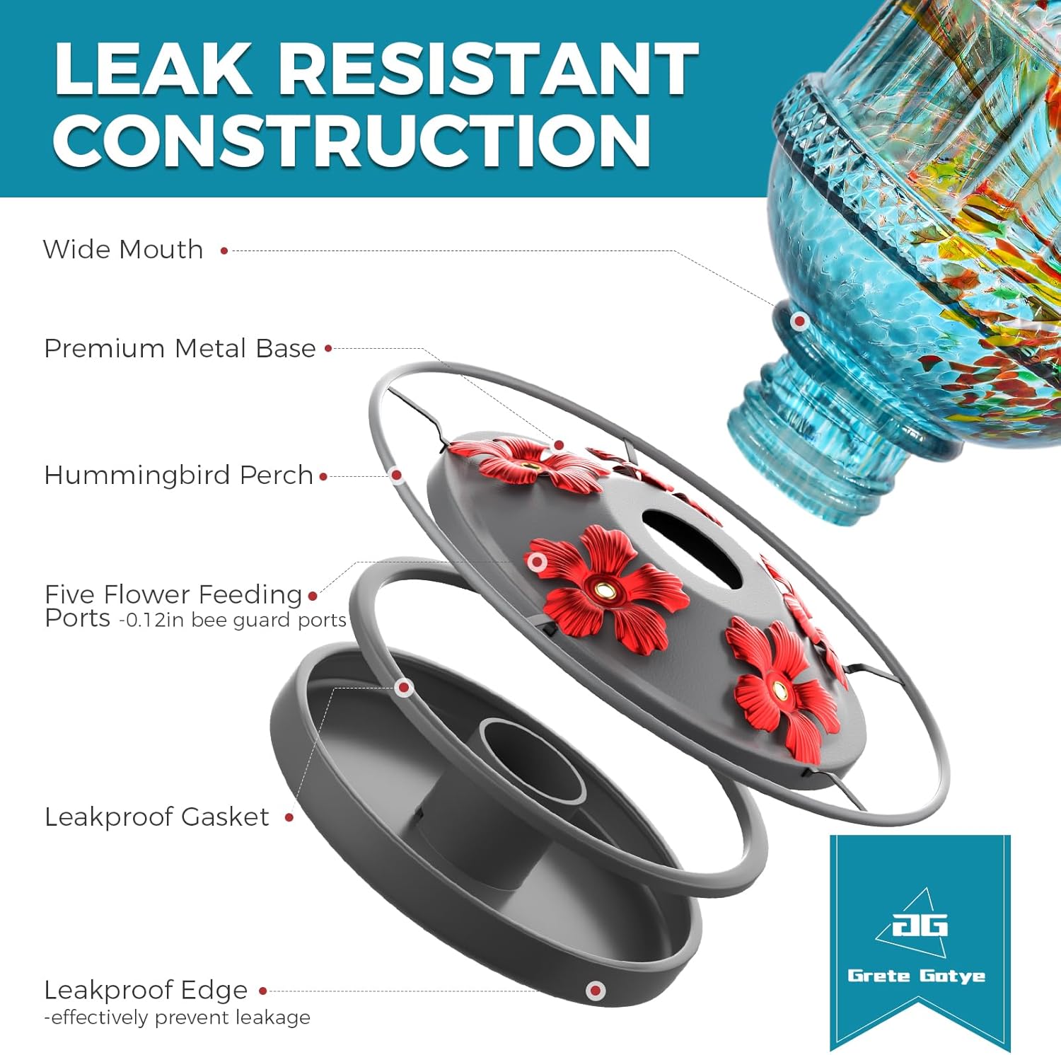 - 🐦️ATTRACT HUMMINGBIRDS: These hummingbirds feeders for outside design with vibrant colors and intricate details, made of a high-quality nectar glass container in a nice matrix shape, ensuring longevity and durability compared to plastic counterparts. Ensuring long-lasting use in outdoor conditions throughout the year and never fading. 5 flower-shaped feeding ports, 25 oz capacity with 5 feeding stations, and perch in a circle to accommodate multiple hummingbirds.