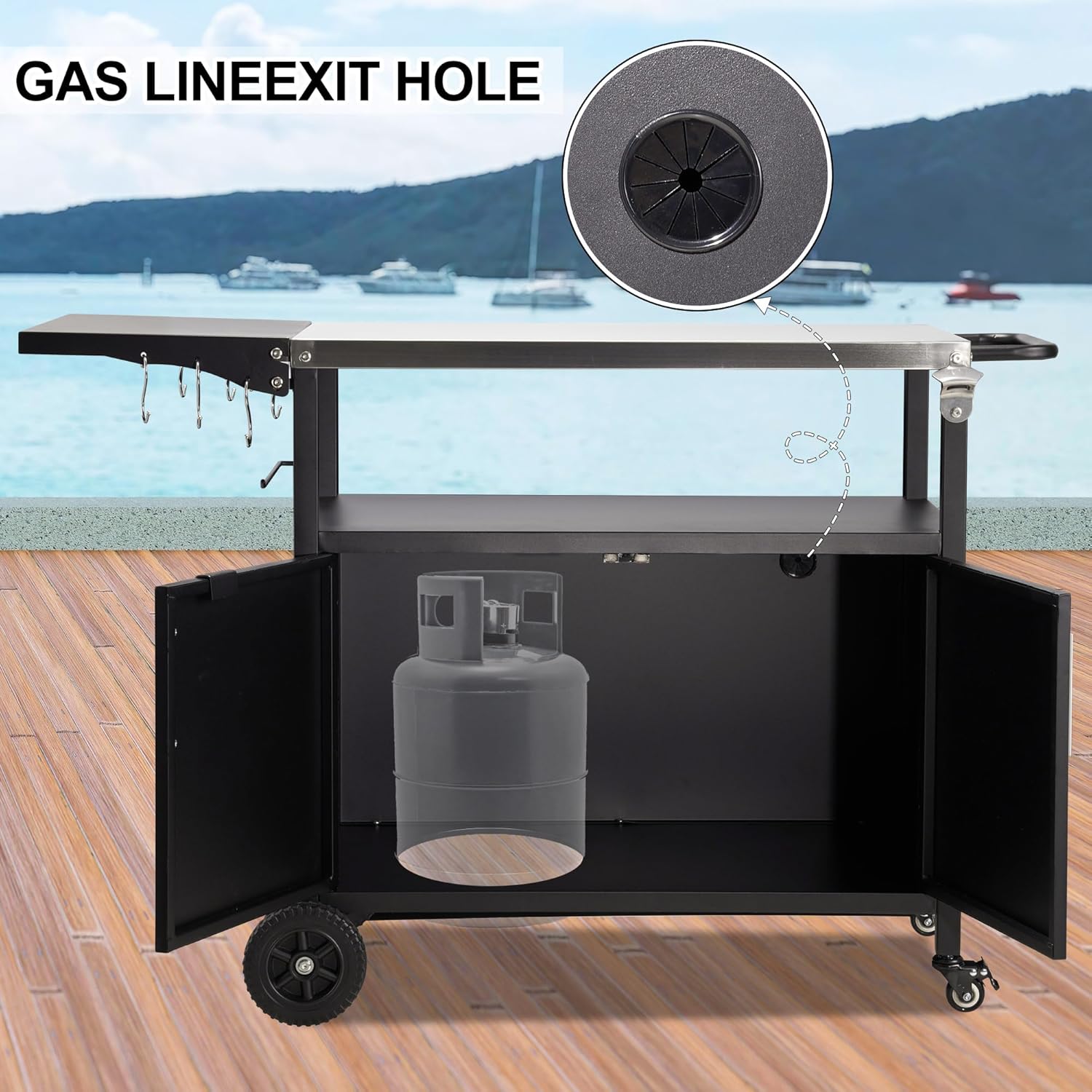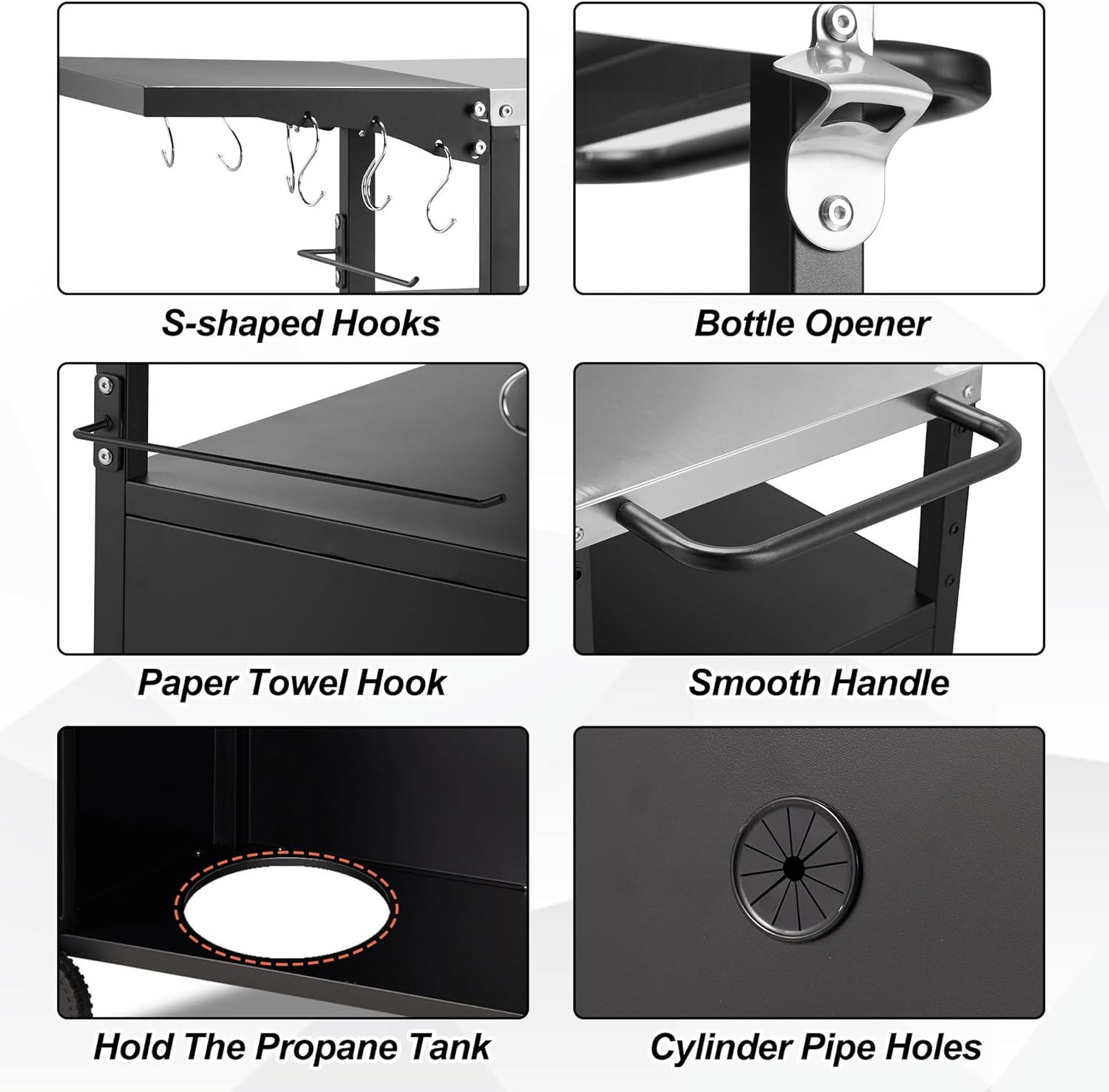 - 【Convenient Grill Table】The BBQ cart is equipped with two big wheels and two smaller, it's easy to push this cart down steps or on the grass. Combining interior storage with an additional open storage making it perfect for keeping all your barbecue essentials at hand. It comes with different hooks and can hang items such cutlery and paper towels. This feature can be used as an indoor dining car or easily rolled outside at any time.