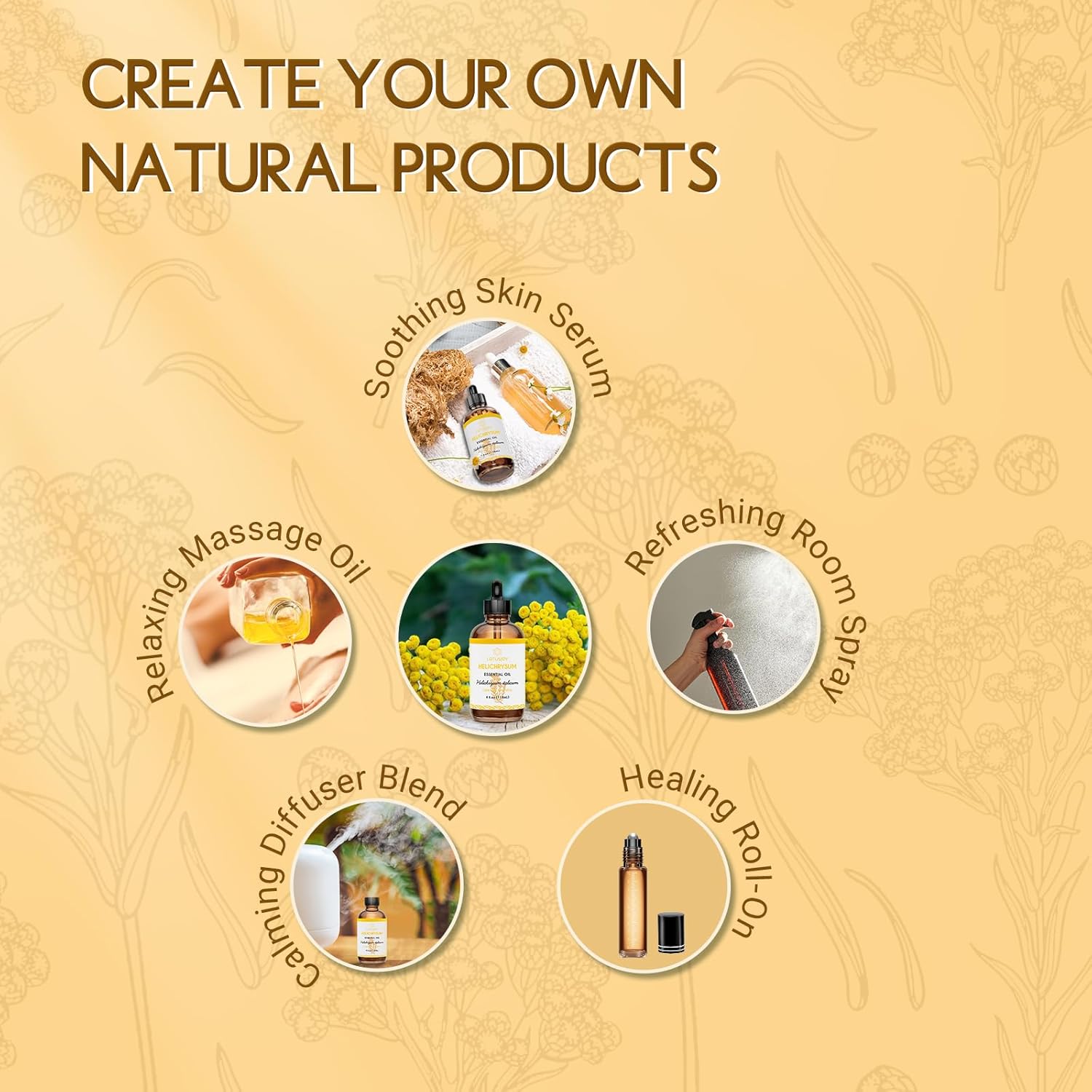 - Versatile Use: With relaxing herbaceous properties, our helichrysum essential oil can be used in a variety of ways. You can dilute it with carrier oils, add it to diffuser, humidifier, your favorite lotion, cream, massage oil, shampoo and more to acheive mutiple results
