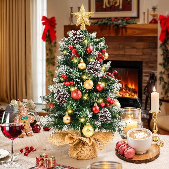 Mini Christmas Tree with Lights, 24 Inch Tabletop Christmas Tree with Berries Star Treetop Ornaments Balls Artificial Small XMS Tree for Table Desk Home Christmas Holiday Decor