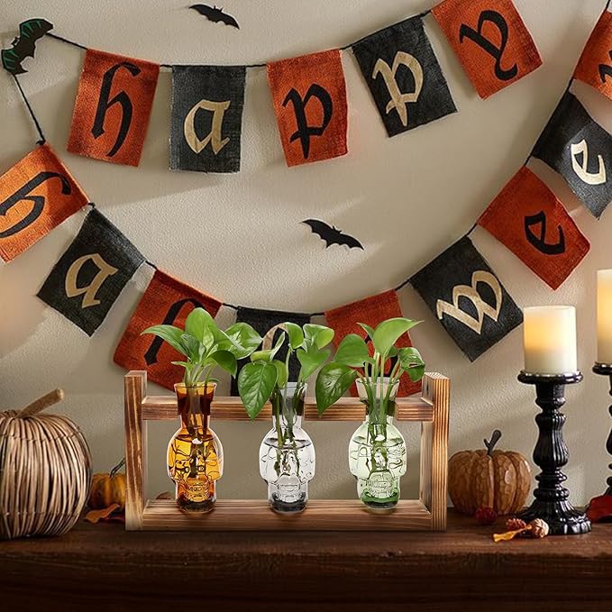 Plant Terrarium Propagation Stations Hydroponics Halloween Skull Planter Vase Skulls Decor with Wooden Stand Gift for Father