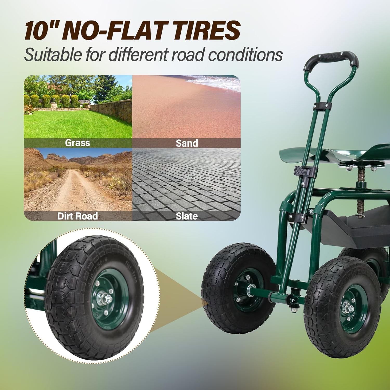 - Durable Rubber Tires - Equipped with four 10’’ wheels, this rolling garden stool moves smoothly on grass, gravel and concrete roads. And the pattern on the surface of the tire enhances stability and prevents skidding on wet ground