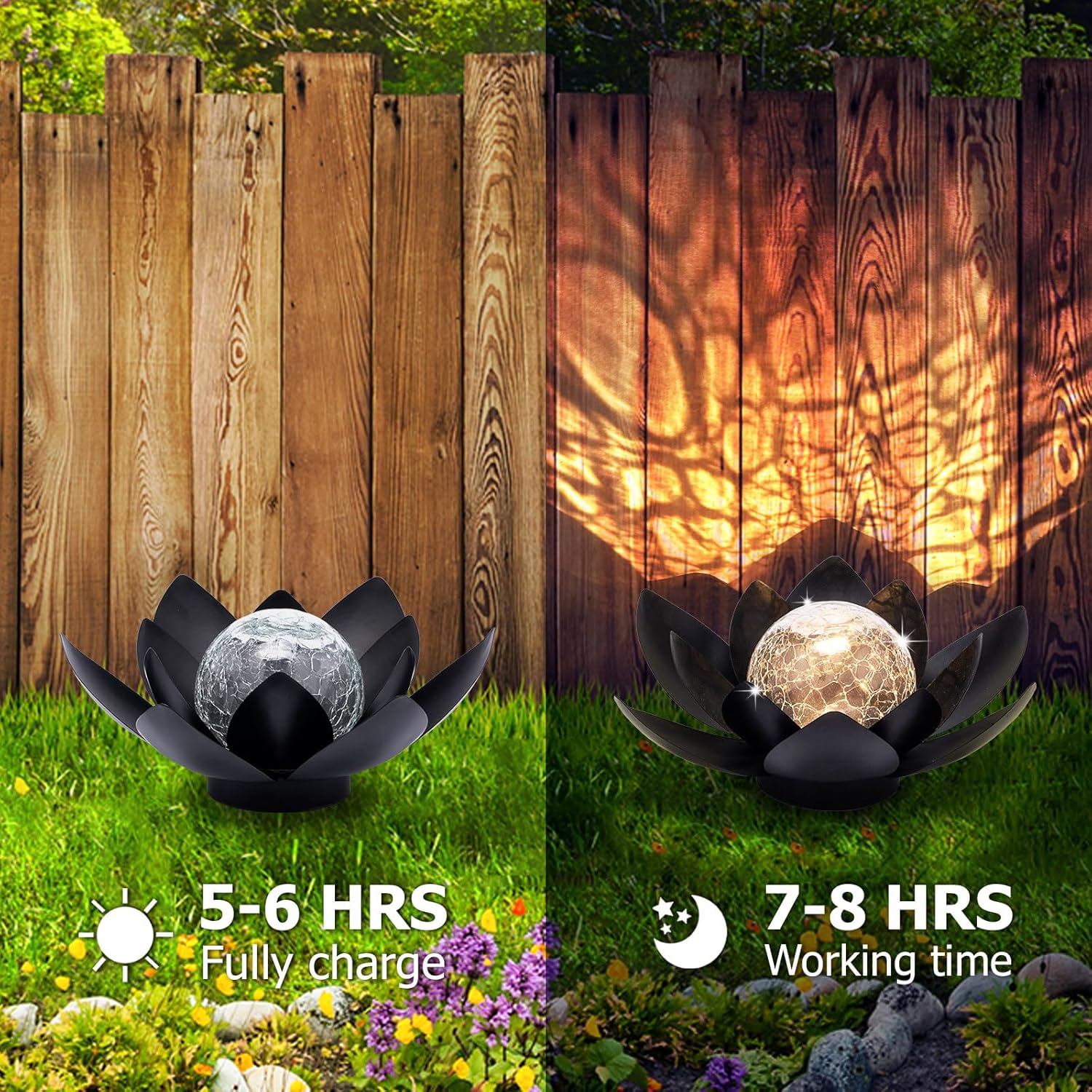 Huaxu Solar Lights Outdoor Garden Decor Metal Black Lotus Decoration, Crackle Globe Glass Waterproof LED Outside Table Lamp for Patio,Lawn, Yard,Walkway,Tabletop,Ground Gifts for Mom
