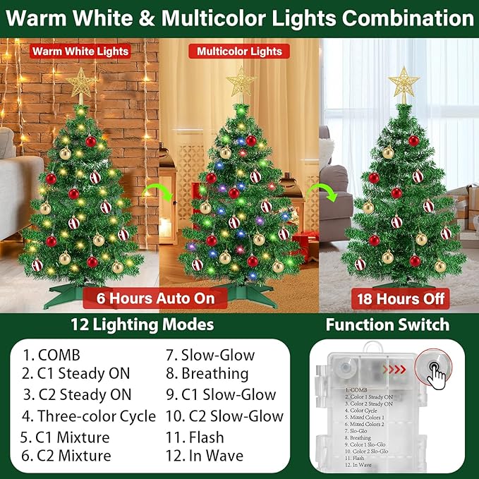 - 【DIY Brighting LED Lights】Small Christmas tree features a 16.4 ft string of 50 warm white and multi-color changing LED lights, ideal for wrapping around your tree. The remote-controlled lights connect to a battery box that requires 3 AA batteries (not included), allowing you to place your tree anywhere without needing a power outlet. Easily add a magical glow to your holiday decor!