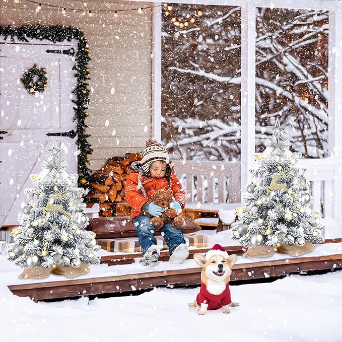 Mini Christmas Tree Prelit, Small Artificial Christmas Tree with Lights, Pre Lit Little Decoration for Table Top Home Cafe Office, Snow Flocked