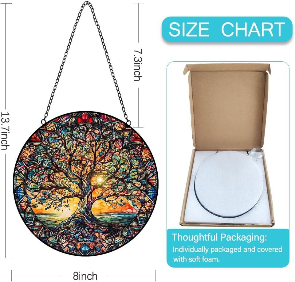 - Glass Art Window Decorations: The upgraded large-size stained glass hanging panels bring you a new decorative experience. This is a very beautiful tree of life decor stained glass window hanging, size is 8 inches which is perfect for any windows, wall or garden space. Stain glass window hanging is the right size to enhance your home decor without blocking the view, it is a good choice for decorating a house