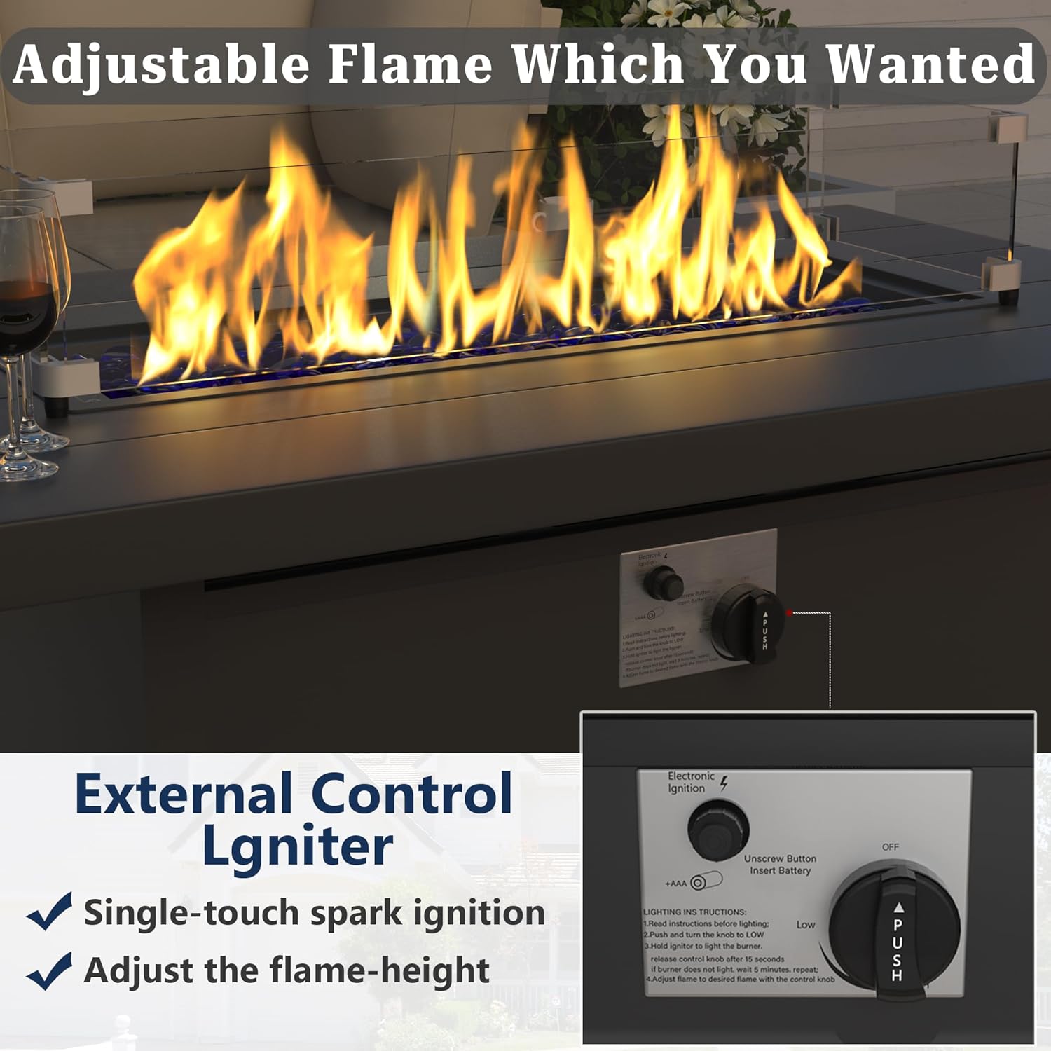 - Glass Windshield: Ignite a warm, inviting flame over the sparkling glass rocks and watch it burn all night, as an included glass wind guard adds elegant appeal while keeping the fire going even during a breeze. The Outdoor Rattan Fire Pits Table provides heat to whoever is around your fire table, we won’t leave you out in the cold