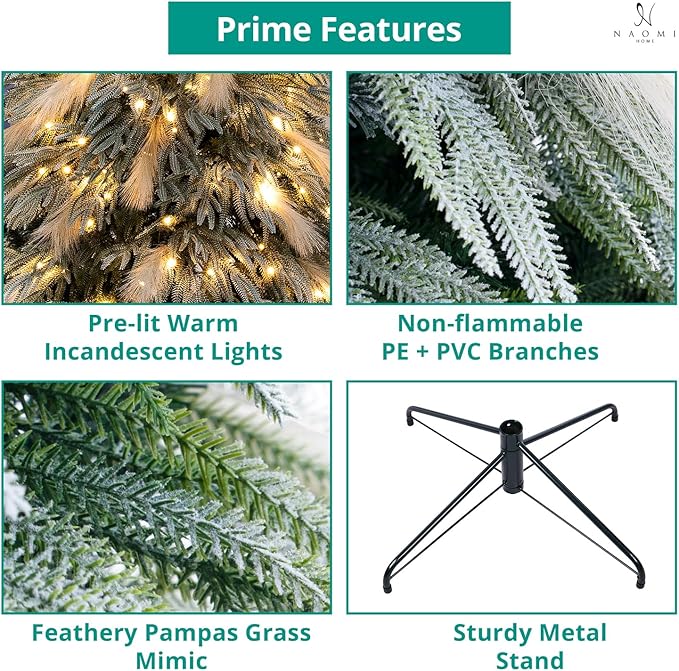 - FEATHERY PAMPAS TIP DESIGN Our Makenna Pre-Lit Artificial Christmas Tree is decorated with feathery pampas tips and snowy tips that are White flocked and is sure to bring warmth to your living room this holiday season.