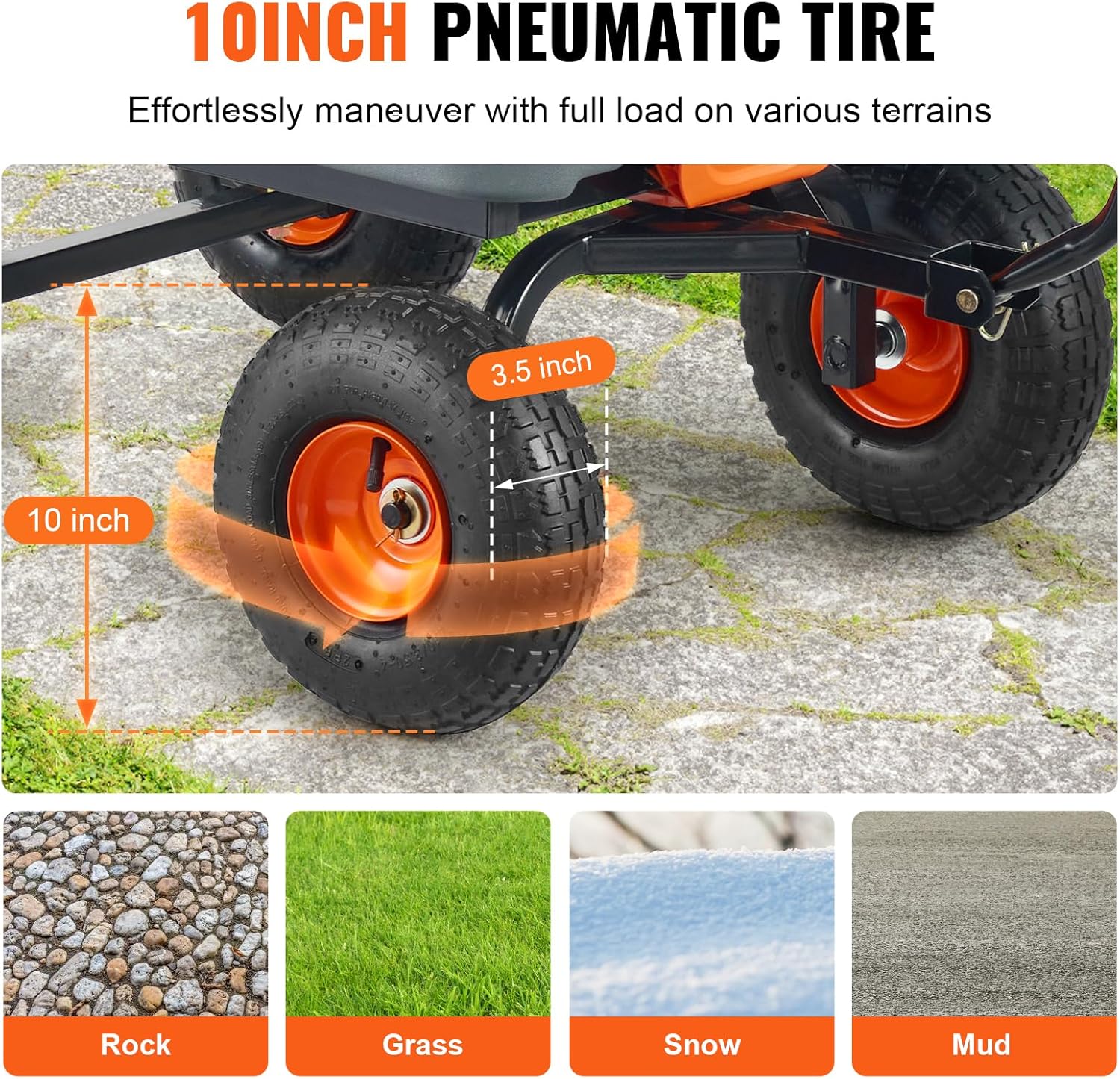 - 10in ALL TERRAIN WHEELS: With 10" rubber tires, the yard cart provides excellent shock absorption, navigating uneven garden terrain or grassy slopes, ensuring smooth transport.