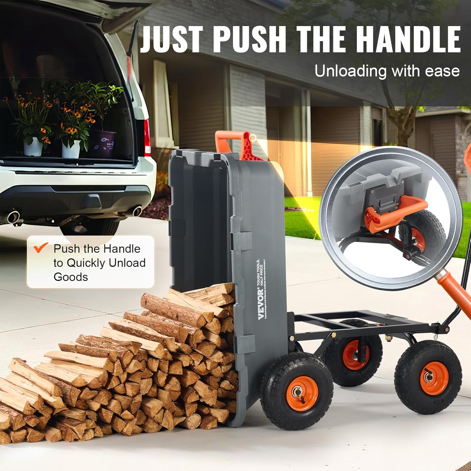- QUICK RELEASE SYSTEM: This poly garden carts is equipped with a front-handle dumping frame, users can quickly unload items. Simply disassemble the bottom of the frame to the garden dump cart. The 180° adjustable handle facilitates effortless maneuvering, doubling your efficiency.