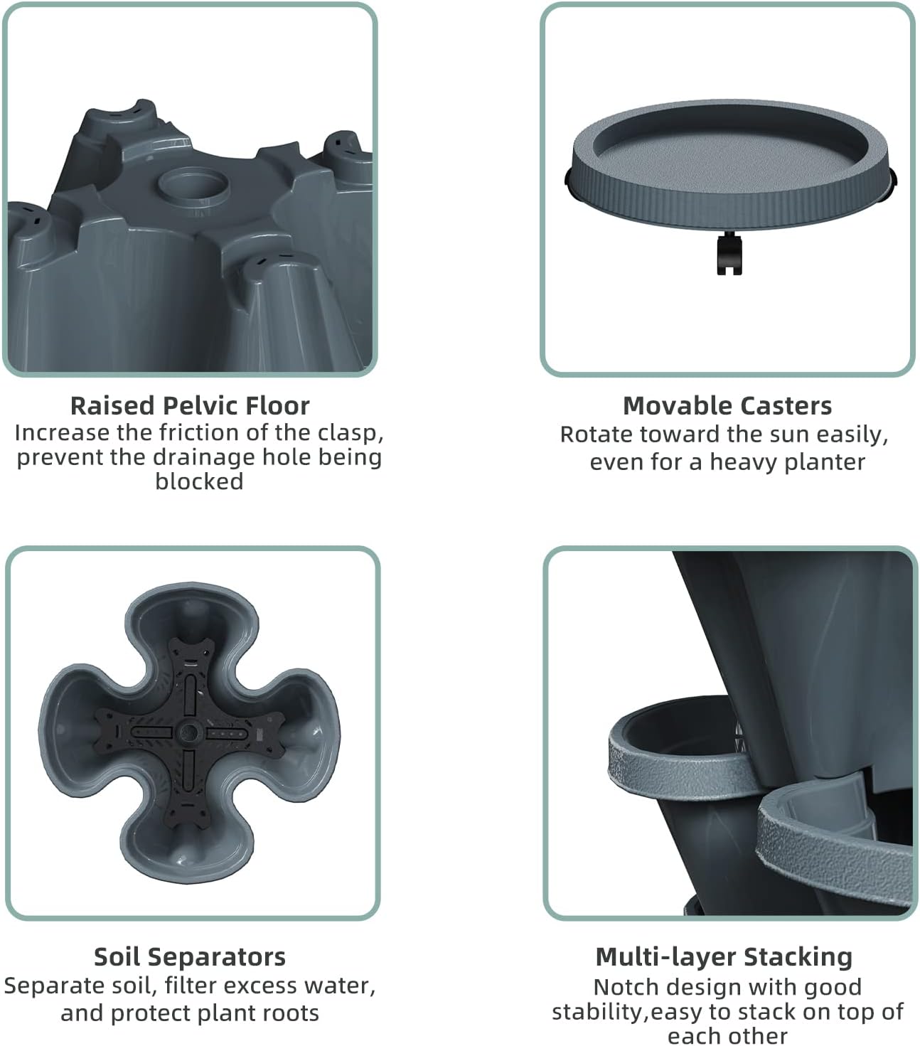 7 Tiered Strawberry Vertical Planter 2 Pack, Stackable Tower Garden Planter Herb Garden Planter with Movable Casters and Bottom Saucer Indoor and Outdoor - Dark Grey