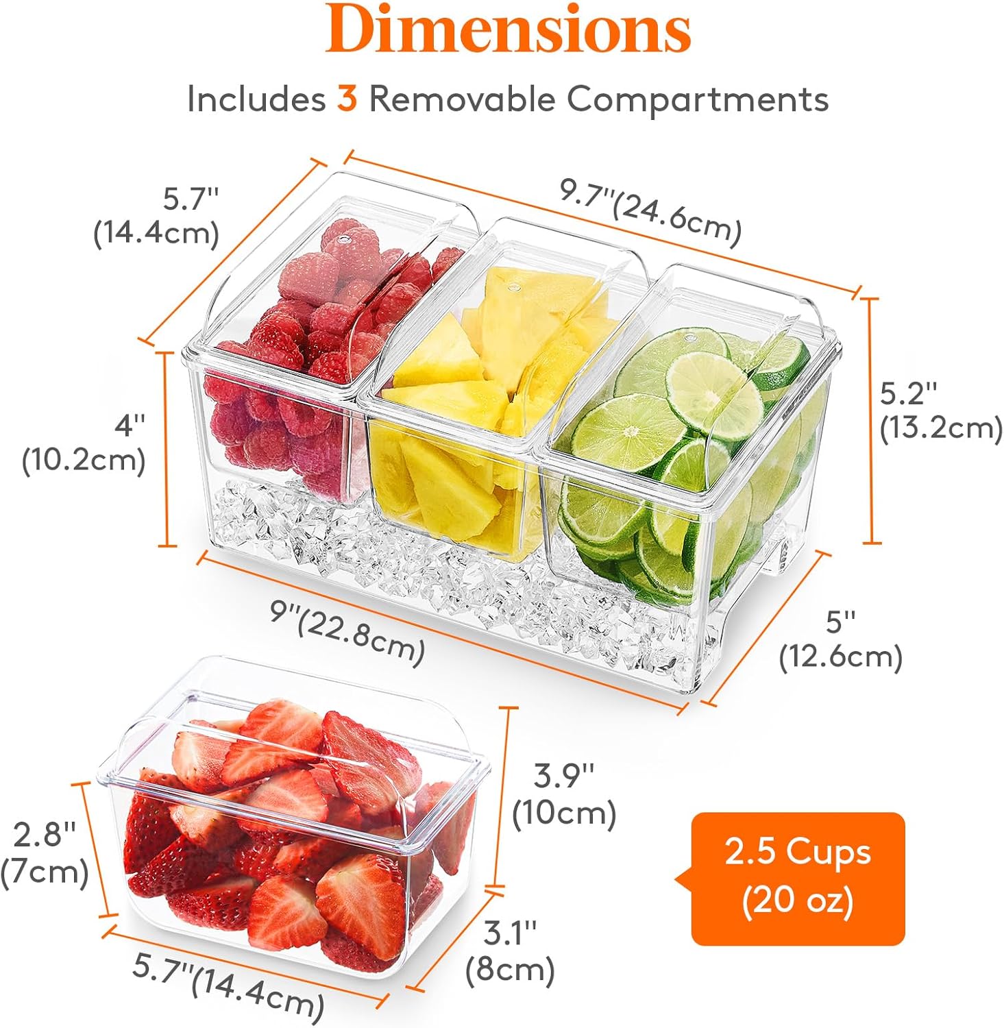- Large Capacity: The chilled serving tray measures 9.7 ร 5.7 ร 5.2 inches and has three removable compartments; Each compartment with a lid is 5.7 ร 3.1 ร 3.9 inches, holds about 2.5 cups (20 oz), and can be easily detached for individual use
