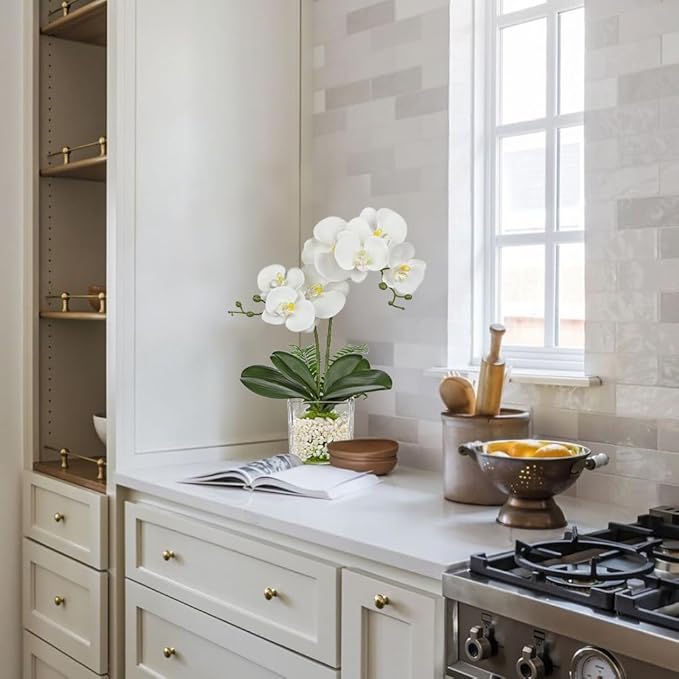 - Faux Orchids Plants for Home Decor - These artificial orchid plant blend seamlessly into any interior style. Style this faux potted flowers on a mantel for a bold centerpiece or place it to accent home offices, spa bathrooms, or coffee tables. It is a perfect decoration to your office, shelf, bathroom, living room, bedroom, window, table centerpieces, dining room, cabinet, desk, kitchen, foyer, hotel, etc. Its simple and realistic design will match any decor style perfectly