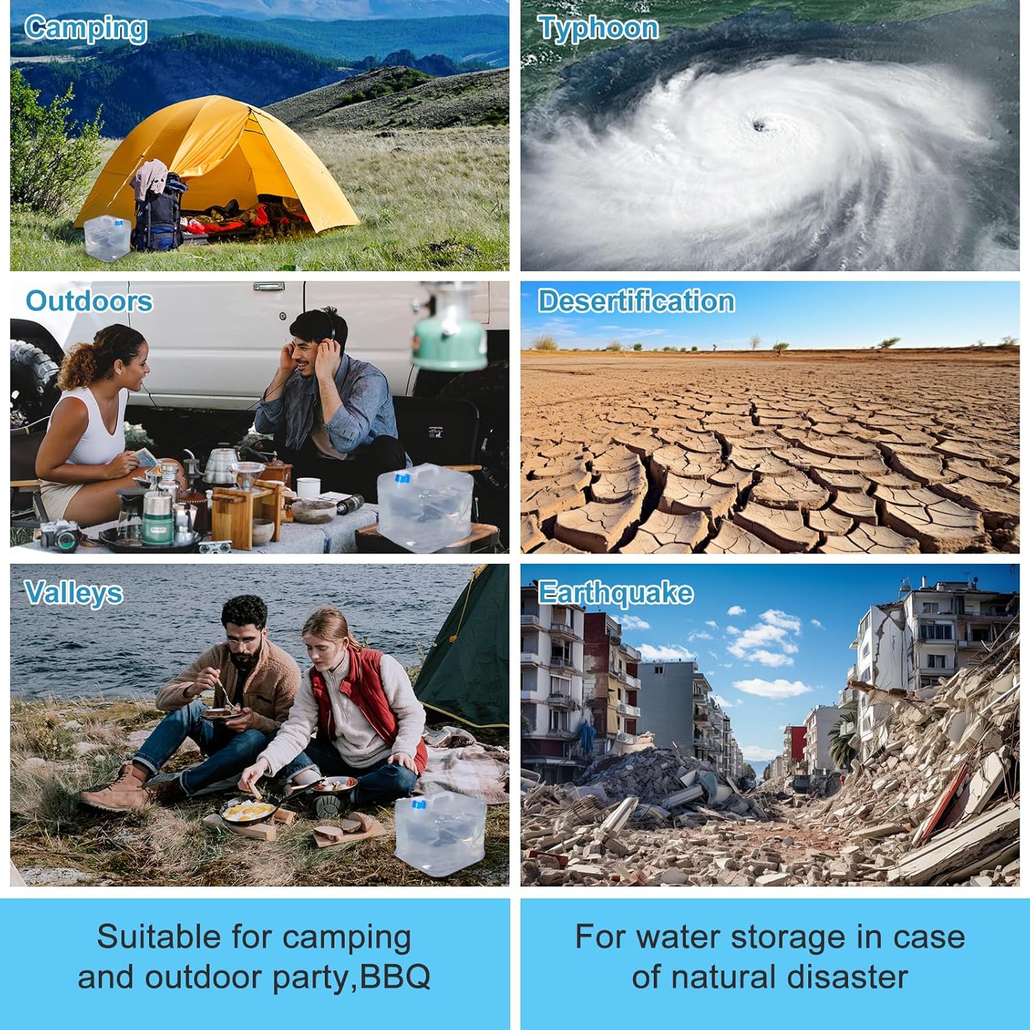 - Use in Emergency Scenarios:Our collapsible water container is ideal for emergency water storage during disasters like tornadoes, fires, tsunamis, or droughts. It’s also great for wild camping, vacations, and adventures where water needs to be stored in a compact, portable form. Whether you’re looking to store 1.4 gallons of water or just need a smaller option, these collapsible containers can handle a variety of scenarios where safe, reliable water storage is critical