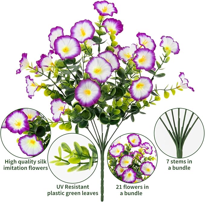 Lnoicy Artificial Flowers for Outdoor 12 Bundles Eucalyptus Fake Flowers for Planter,UV Resistant Fake Morning Glory for Home/Porch/Garden Decoration(Purple/White)