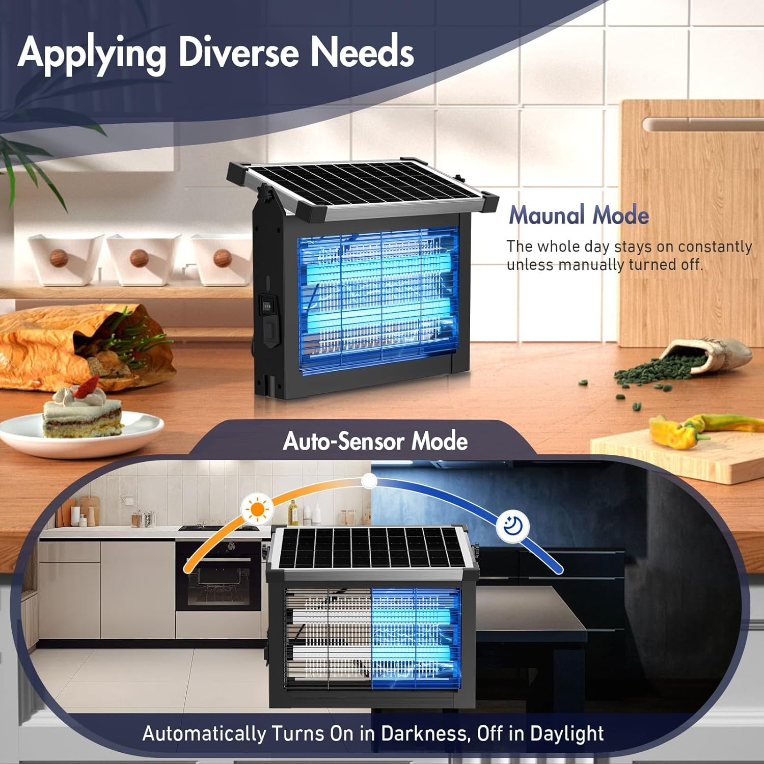 - Smart Dual-Mode Operation β Manual Mode allows the mosquito killer to deliver 24/7 intelligent protection, ensuring mosquitoes are solved whenever needed. In Auto Mode, the mosquito zapper outdoor auto sleeps during solar charging and auto-on when charging ceases - Increasing energy-saving efficiency by 40%.