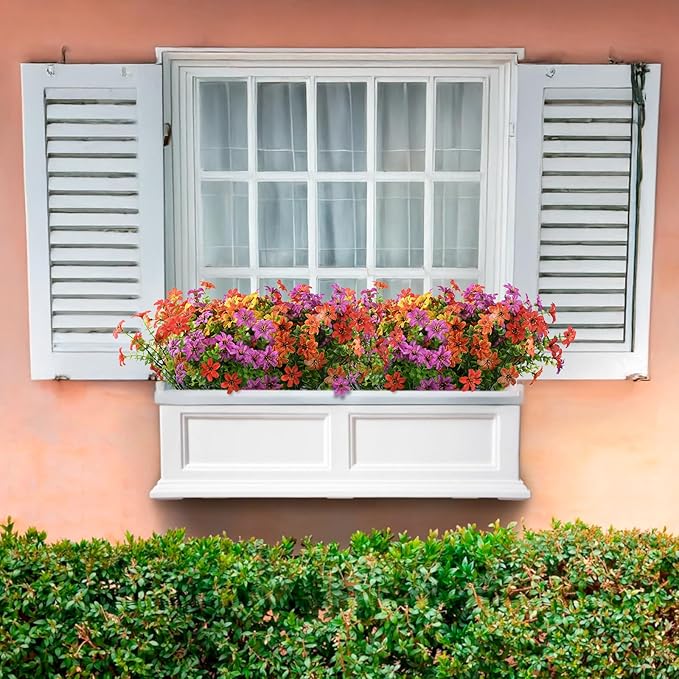 - All Seasons and Occasions: These faux plants are suitable for outside, vase, pot, hanging basket, front door, front porch, lawn, patio, yard, walkway, back deck, veranda, balcony, window box, windowsills, garden or other indoor and outside decorations. Unlike fresh flowers, these fake outdoor flowers are always in full bloom and vibrant, emitting the fresh breath of nature. You can enjoy the beauty of blooming flowers throughout the year, no matter the weather