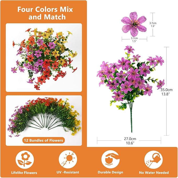 - Package Include: The package of the fake flowers outdoor comprises a total of 12 bundles, featuring three branches each of four colors flowers. You can DIY these different colors flowers according to your personal preference. Colorful blooms allows for creating stunning flower arrangements and bouquets. Warm Tips: Pot is not included