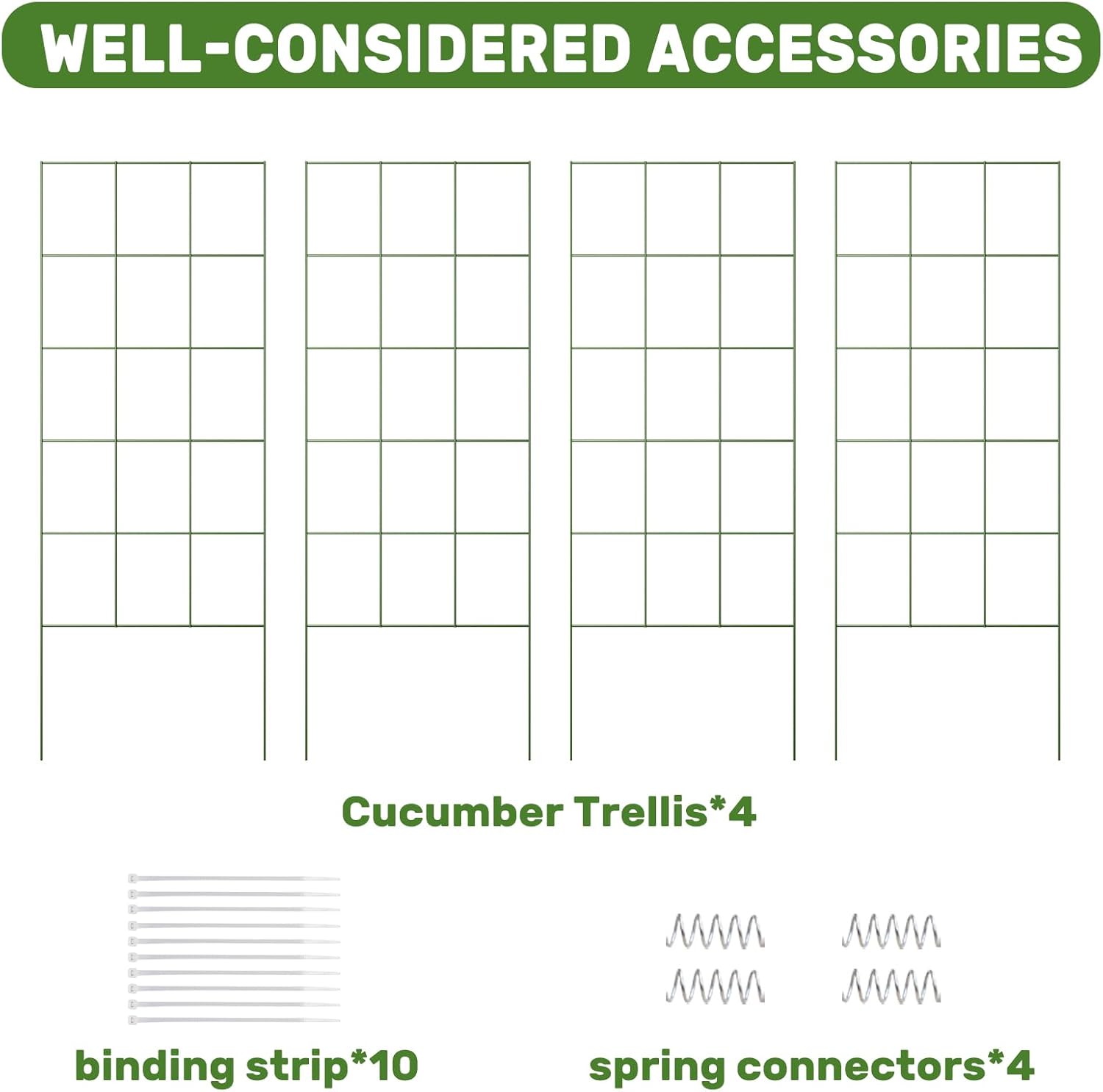 - Cucumber Trellis Material: Constructed with 4mm plastic-coated steel core, the garden trellis ensures reliable strength and long-lasting performance. The powder-coated steel frame is strong enough to support heavy loads and has big 6"*7.5" grid openings for easy harvesting.