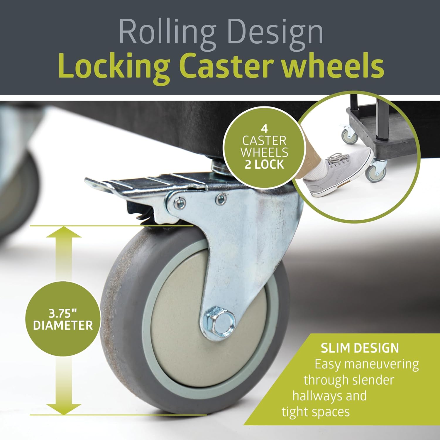 • PUSH HANDLE AND CASTER WHEELS: Complete with an ergonomic push handle and four 3.75" diameter caster wheels, two of which lock