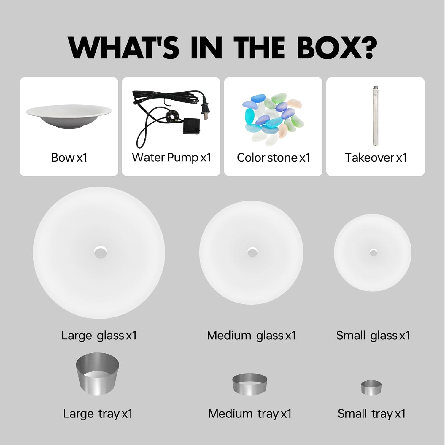 - 【High Quality Fountains】The size of indoor tabletop fountain is about Dia 12.6" x H 6.3", made of high quality aluminum alloy and glass material. The unique circular glass design and silver base make the modern fountain decor more high-end.