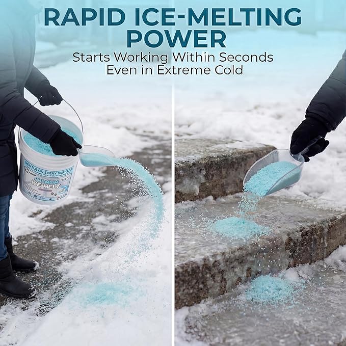 - Easy Application Bucket – Includes built-in scoop for fast, even spreading. Designed for applying ice melt for pets on walkways, steps, patios, or driveways during icy winter conditions.
