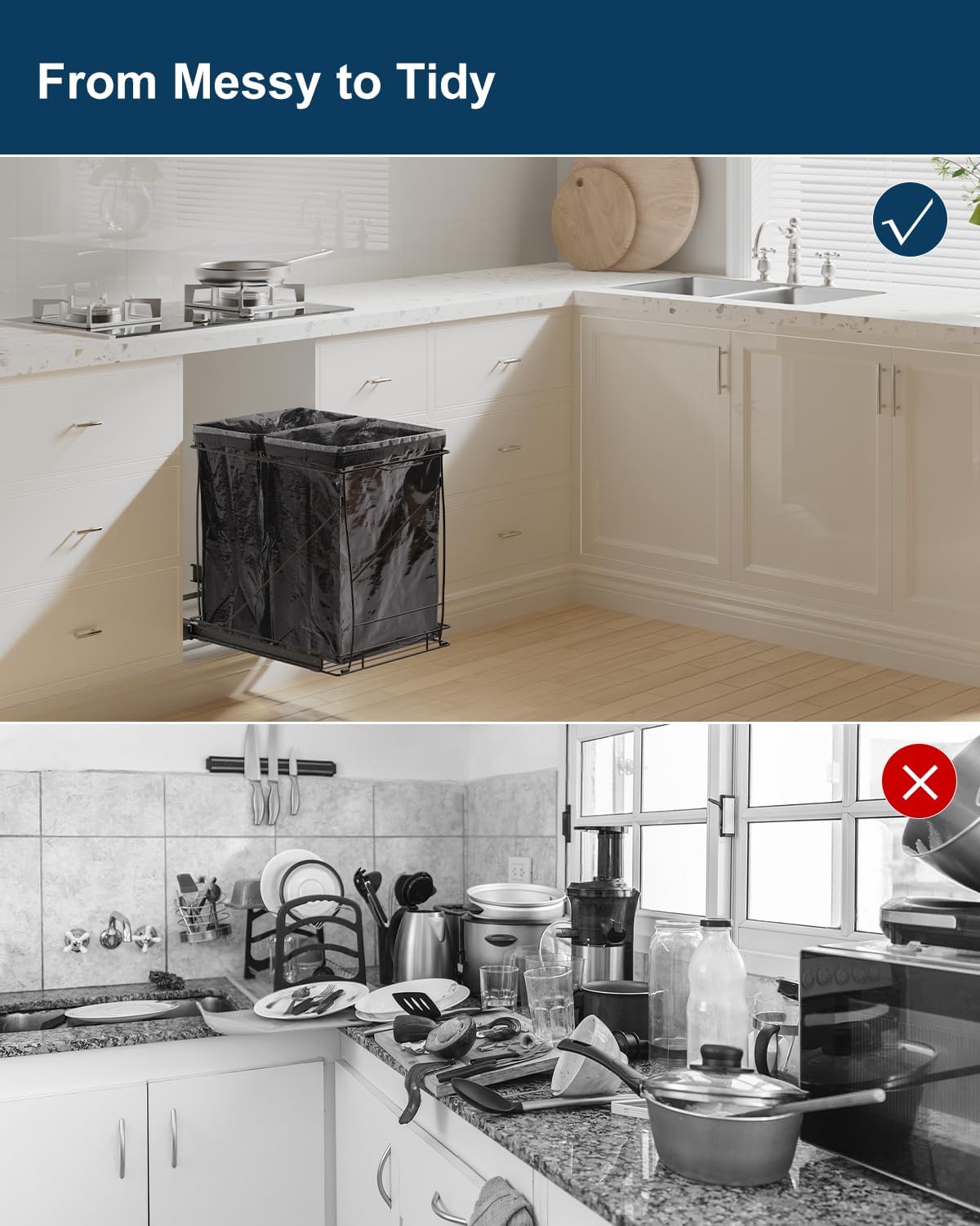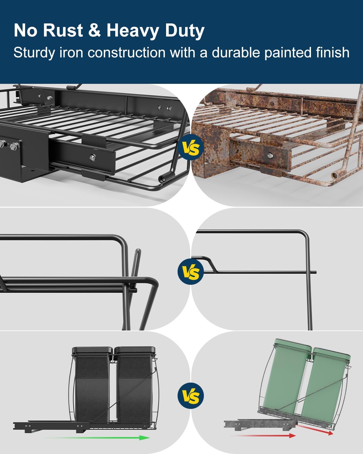 - Durable & Rust-Resistant Frame: Built to last! The sturdy metal frame offers excellent weight-bearing capacity, resists rust, and stands up to daily use. Whether you're tossing kitchen scraps or heavier items, you can count on this double under sink garbage cans for long-term, reliable performance