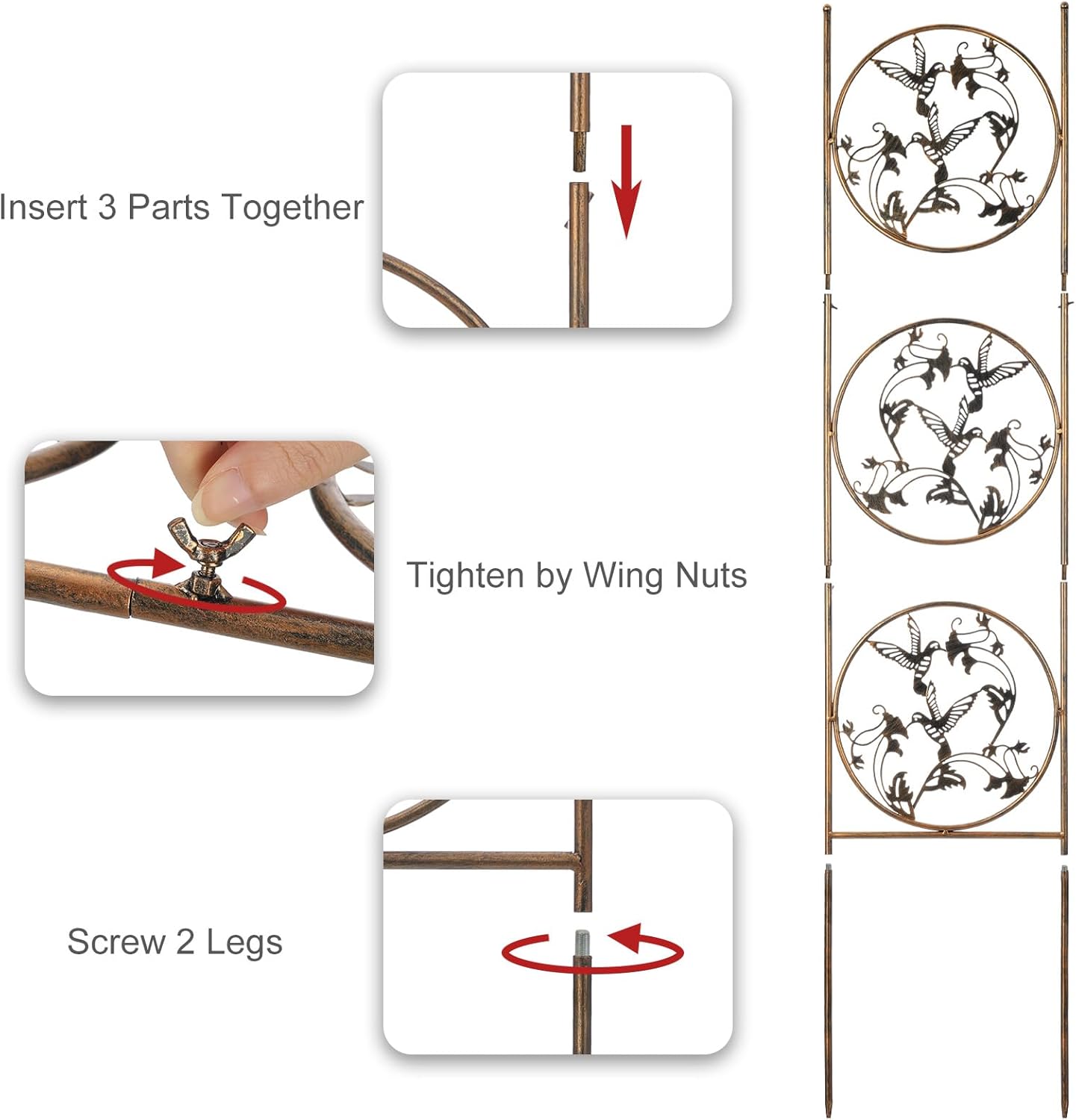 - Easy to Assemble: This pair of trellis is handcrafted and constructed of sturdy, it made from iron under a thick finish of bronze powder-coat. Easy installation is required, just insert 3 parts together, tighten by wing nuts and screw 2 legs on to stake into the ground or potser, privacy screen, or along a building. It’s also a unique and thoughtful gift for someone loves gardening