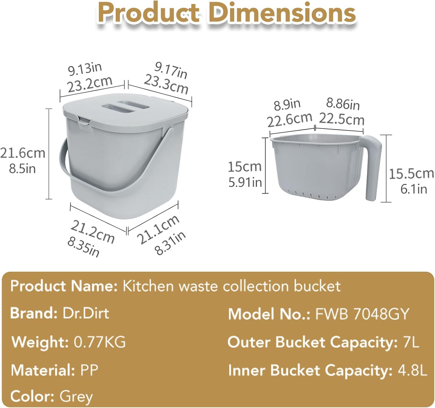 DrDirt Kitchen Compost Bin, 7L(1.85 Gal) Kitchen Compost Bin Countertop with Sealed Silicone Ring Lid, Odor-Control, Liquid Separation, Easy to Clean, for Cooking Family and Home Party, Gray