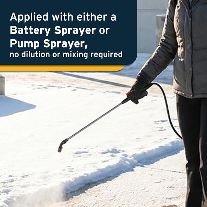 - Pretreat Surfaces: Apply 1 gallon of this liquid ice melt per 1000 sq ft up to 48 hours, using a pressure sprayer, before a snowfall to prevent ice buildup.