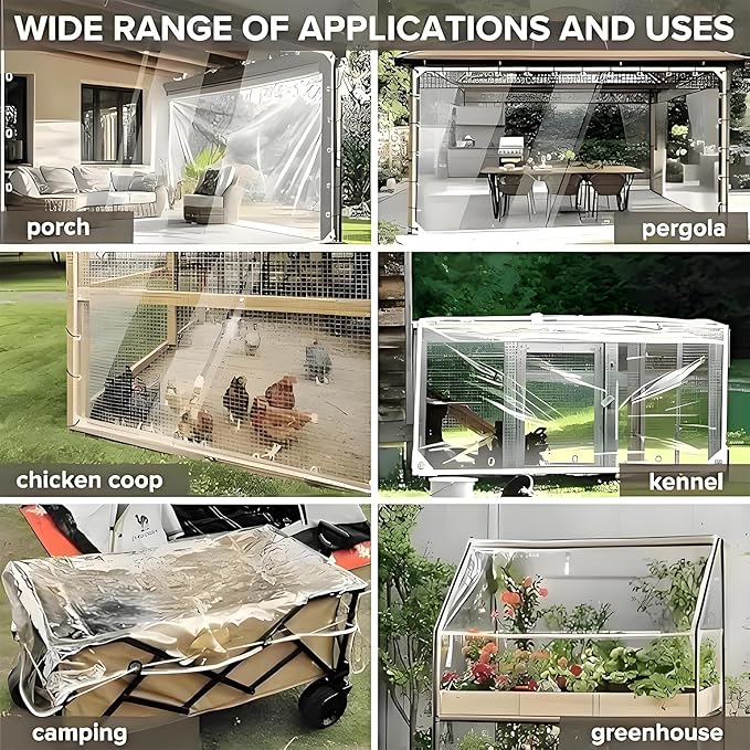 - TRANSPARENT DESIGN: clear tarp is made of high quality transparent PVC vinyl material .The clear design of the tarpaulin makes it an excellent choice for outdoor activities such as camping, picnics, or outdoor events where you want to enjoy the view while still being protected from the elements.Clear vinyl tarp allows light to pass through it .