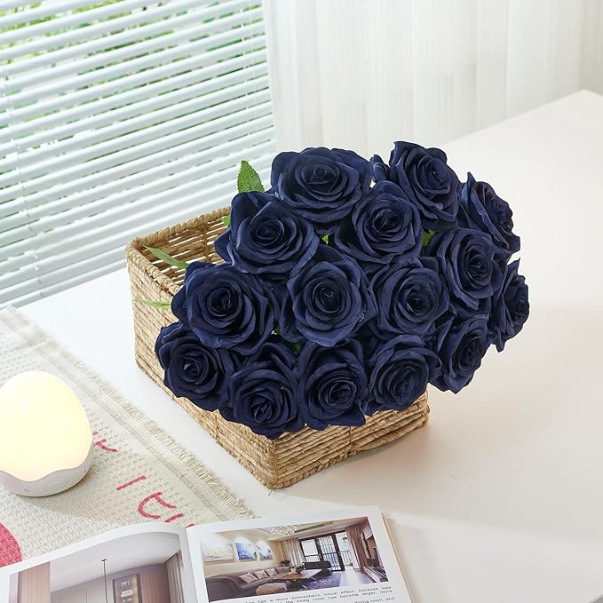 50pcs Navy Blue Roses Artificial Flowers Bulk Fake Roses Silk Flower with Stems Realistic Flowers for Wedding Centerpiece Party Birthday Decor