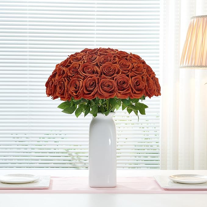 50Pcs Burnt Orange Roses Artificial Flowers Artificial Silk Roses Bulk,Fake Roses Flower with Stems Realistic Flowers for Wedding Centerpiece Home Party Decor
