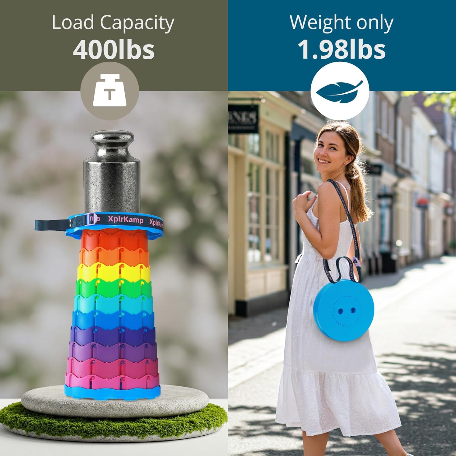- Durable & Multi-Functional: Engineered with reinforced polypropylene (PP) plastic and a proprietary fish-scale design, this portable seat is tested to support 400lbs static weight (ASTM F1854-18) through multi-tier interlocking joints and anti-tilt supports. Features a non-slip base for enhanced stability and The included adjustable strap is up to 22in, which is convenient for you to carry..Available in 5 vibrant colors with reinforced legs, seamlessly transitioning from camping/hiking adventures to home/office daily use