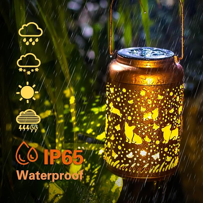 - 🌧️ Built to Withstand the Outdoors – Crafted from high-quality, weather-resistant metal, this dog lantern is ready to take on whatever the elements throw its way. Whether it’s rain, snow, or sunshine, this little Corgi will keep on glowing! With durable LED lights and energy-efficient solar cells, it’s designed to shine all year round. Rated IP65 for waterproofing, this lantern is built to last through all seasons, keeping your garden glowing without worry.
