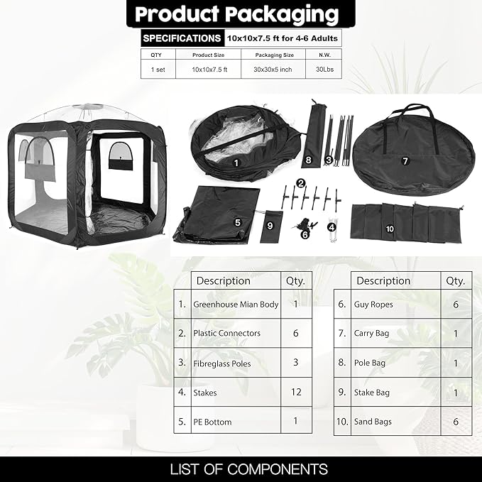 - LARGE SPACE - The size of the greenhouse is 305*263*230CM/120"L x 103.5"W x 90.6"H, weighing12kg, which is about 26.5 pounds and folds down to a travel size of 30.7"L x 30.7"W x 5.12"H