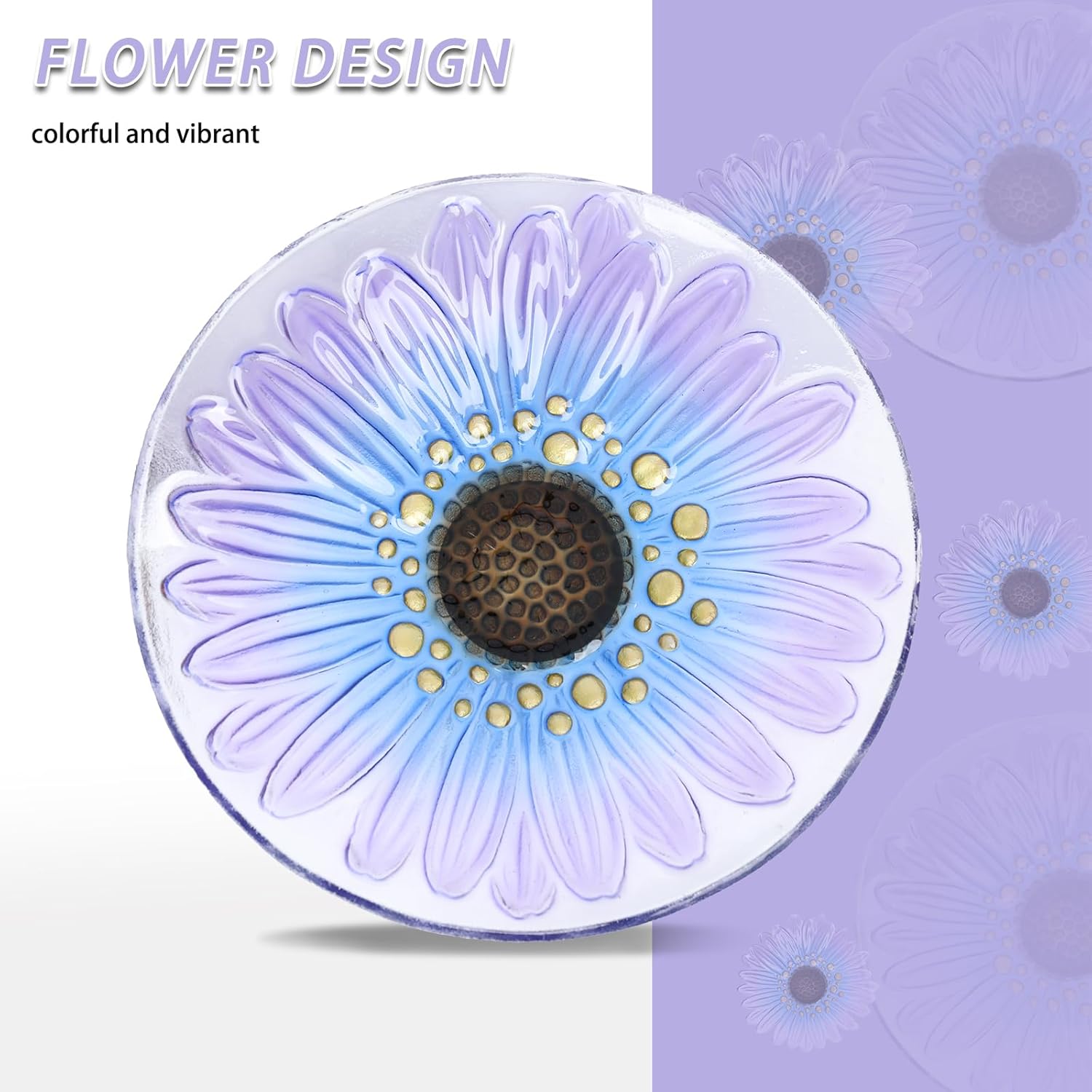 - {Purple Daisy Flower Birdbath} Uses special substantial nontoxic glass, causes zero harm to birds and other creatures, and this glass bird baths for outdoor has beautiful daisy flower as well as distinctively bright-colored which would attract more birds to bathe