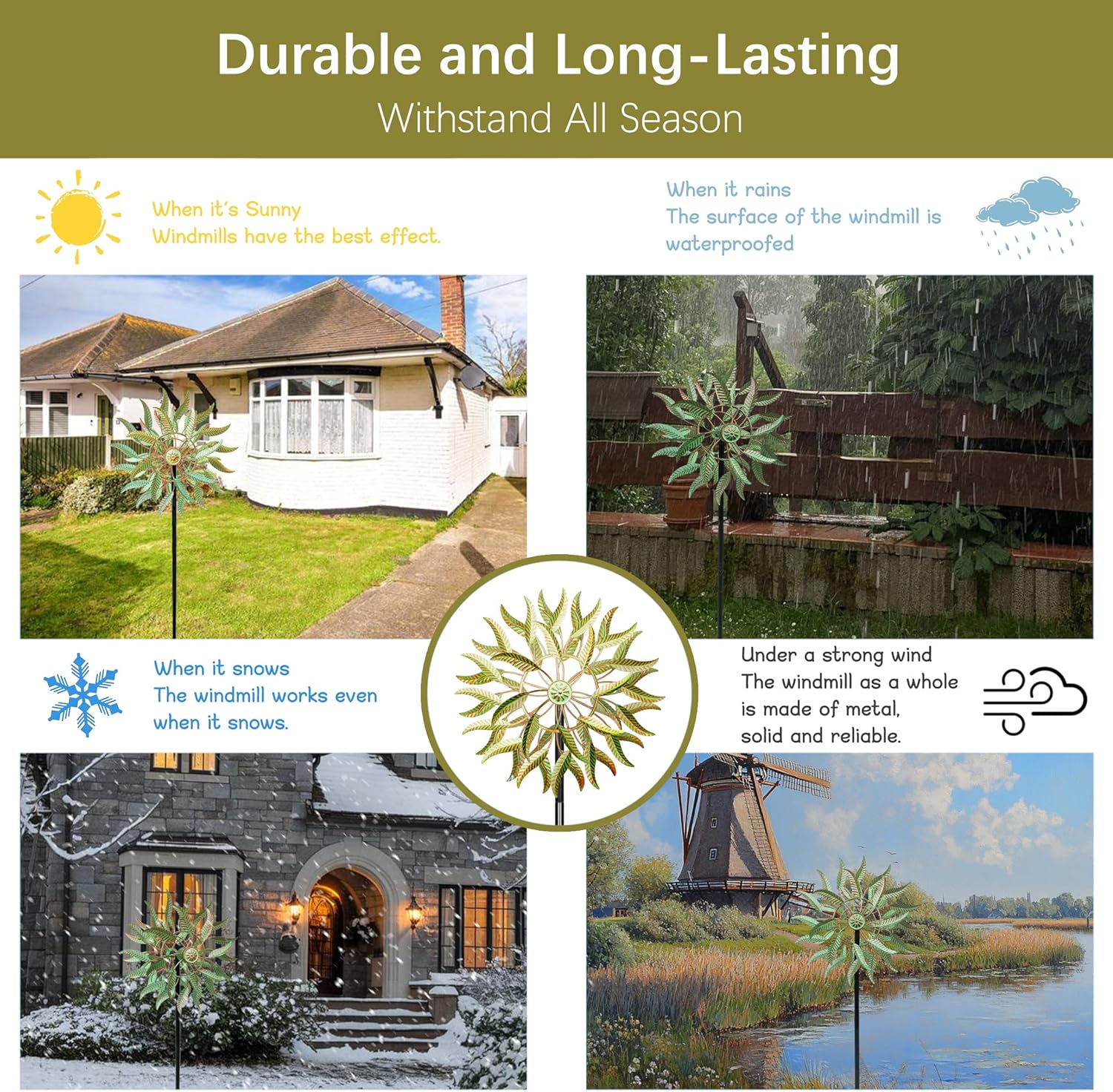 - LARGE WIND SPINNERS: Add a touch of pizzazz to your outdoor decor with the Metal Wind spinner. It spins with the breeze and shines in the sunlight. Great for trails, patios, lawns and garden decorations.