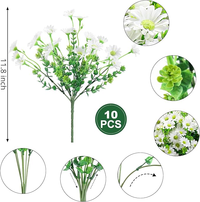 10pcs Outdoors Artificial Mum Flowers UV Resistant Daisy Fake Silk Chrysanthemum Greenery Faux Eucalyptus Plants for Spring Summer Garden Patio Window Box Planter Home Decor(White)