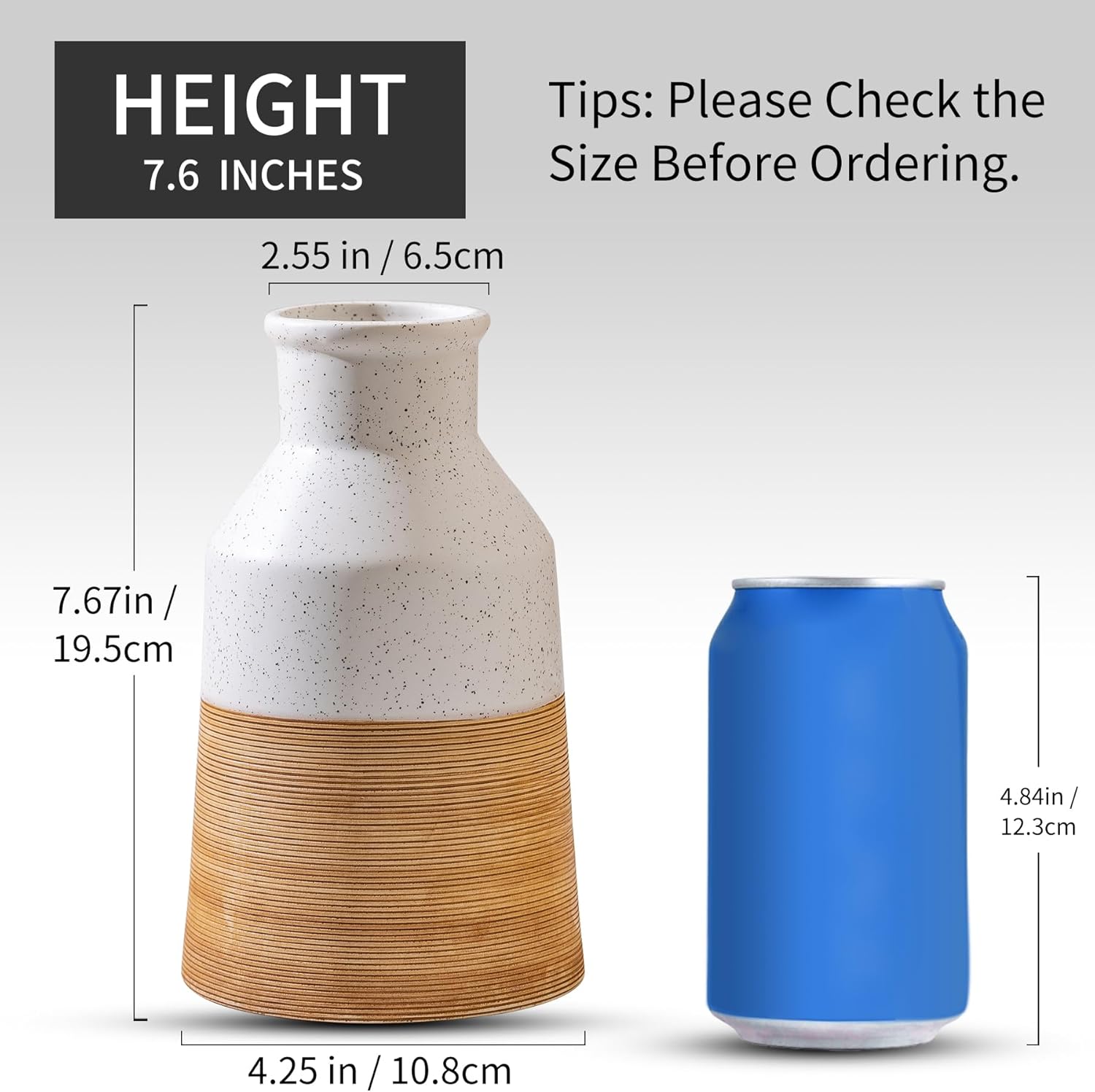 Rustic Farmhouse Flower Ceramic Striped Vase, White and Brown Decorative Ceramic Modern Floral Vase for Bouquet, Cottage Home Core Decor, Tabletop Bedroom Office Bookshelf Living Room Wedding 7.7 Inch