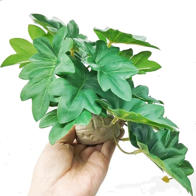 - Reptile tank decor plants: This is a lush, realistic reptile plants. It has beautiful colours and unique shapes, with large, lush leaves that provide excellent hiding places and climbing branch for reptiles. Aesthetically pleasing terrarium plants with practicality.