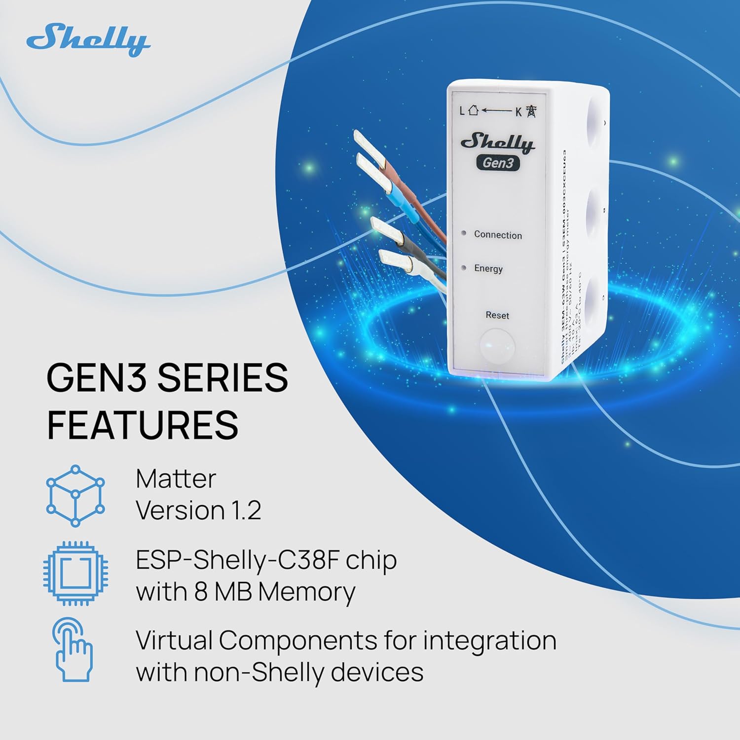 - Shelly 3EM-63W Gen3 is a smart energy meter for monitoring three-phase systems or three single-phase circuits. It features 4-quadrant measurement, real-time data with optical pulse indication, Accuracy Class B, photovoltaic system support, and easy integration into smart home or professional setups. *No Switching Capability Included