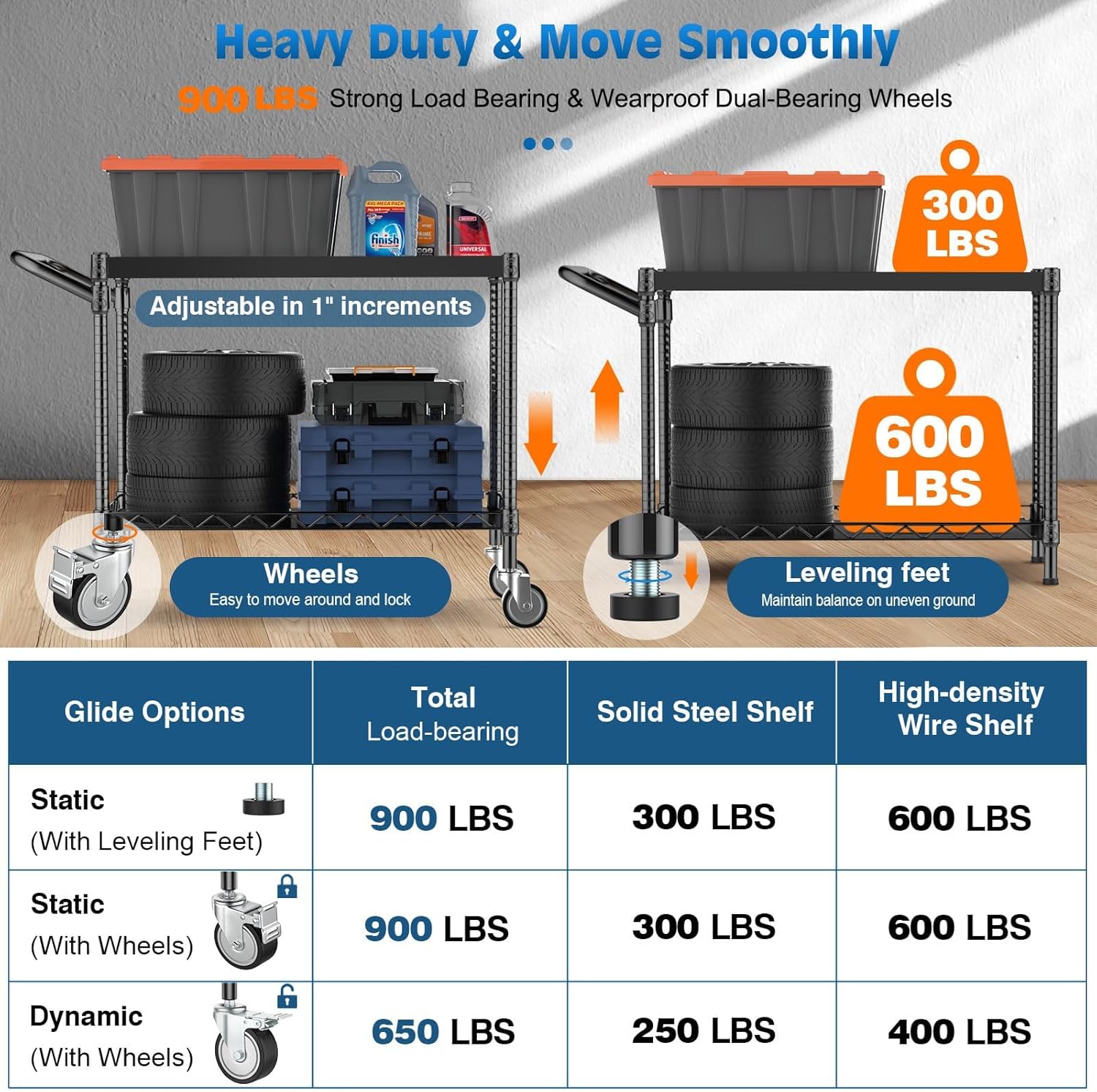 - 【Heavy Duty Utility Cart】*Static load capacity (with leveling feet or wheels): the first layer of solid steel shelf can bear 300 LBS, the second layer of high-density wire shelf can bear 600 LBS, total weight capacity of this rolling tool cart is 900 lbs. *Dynamic load capacity (with wheels): the first layer of solid steel shelf can bear 250 LBS, the second layer of high-density wire shelf can bear 400 LBS, total weight capacity is up to 650 LBS.