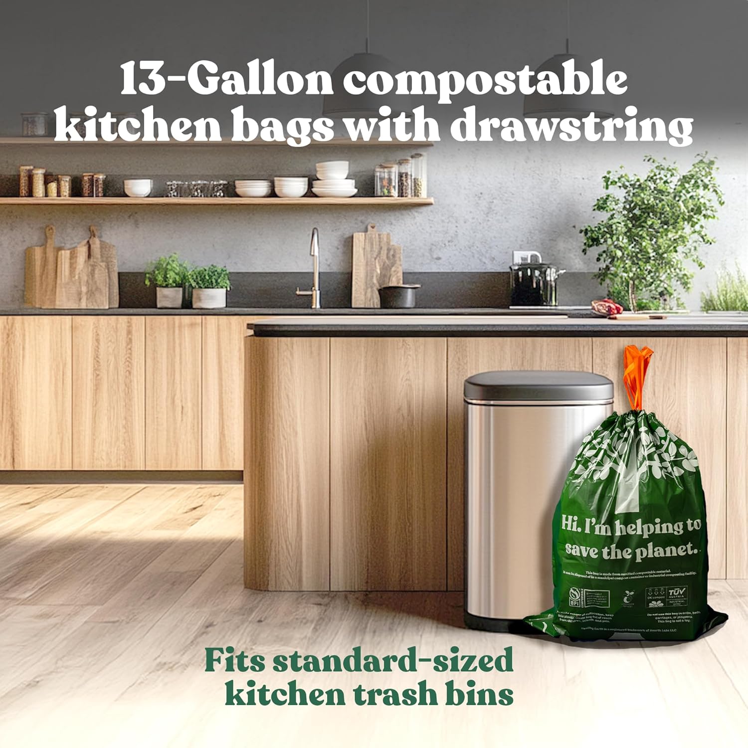 Healthy Earth 13 Gallon Compostable Trash Bags – Tall Kitchen Garbage Bags with Drawstring Handles, Extra Thick Plant-Based Liners, BPI & TÜV Certified ASTM D6400, Heavy Duty Leak-Proof (30 Count)