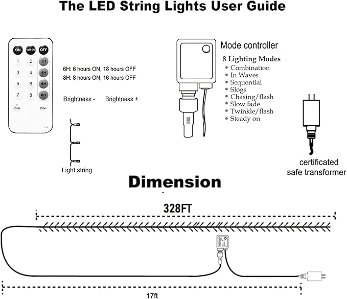 - Remote Control: The Halloween string lights can be controlled with wireless remote, you can set different modes, timer, brightness, etc. There are 8 lighting modes (combination, in waves, sequential, slo-glo, chasing/flash, slow fade, twinkle/flash, steady on). It also has 4 timer modes, "2H" (2 hours on/22 hours off), "4H" (4 hours on/20 hours off), "6H" (6 hours on/18 hours off), "8H" (8 hours on/16 hours off)