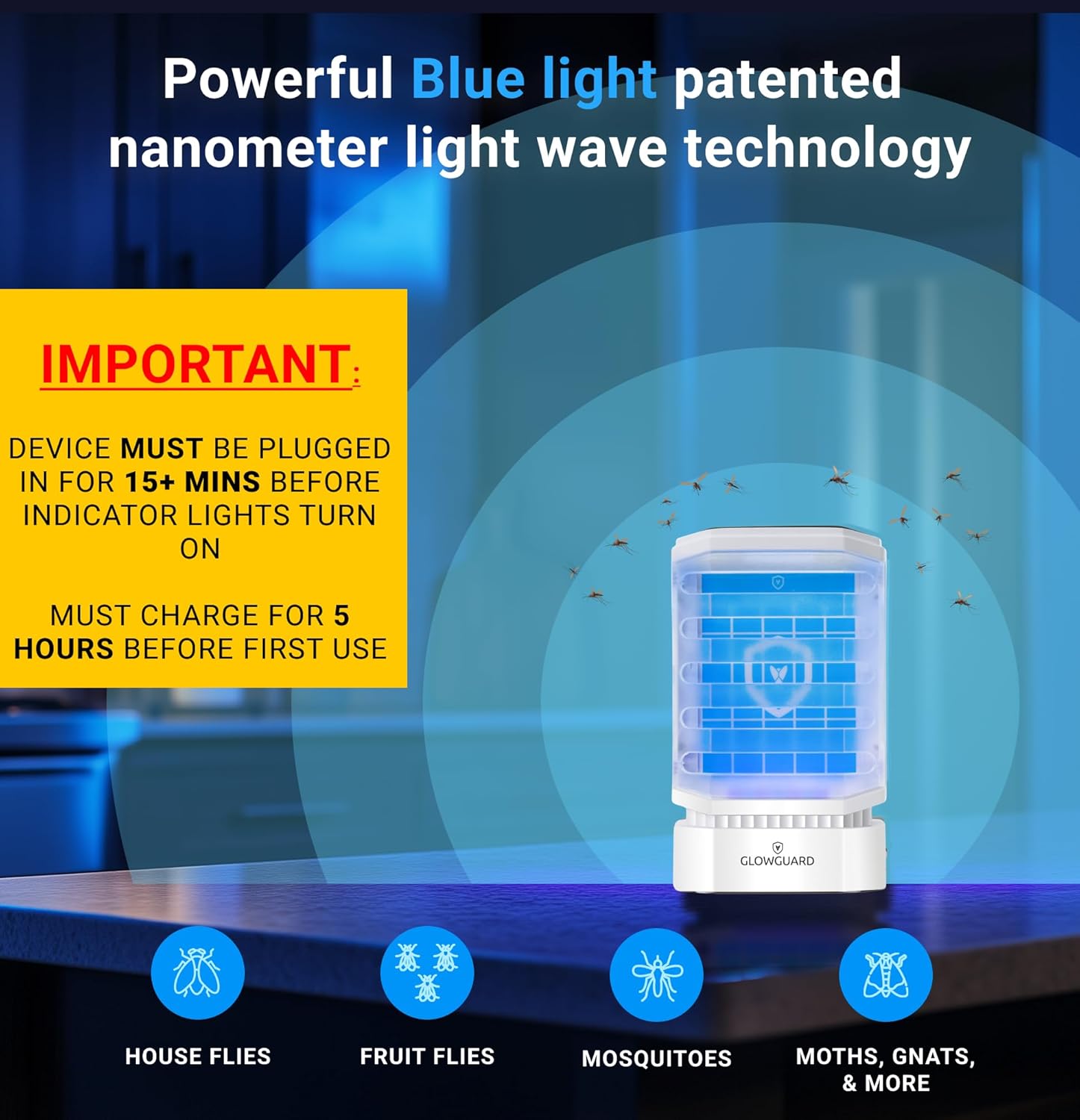 GlowGuard Cordless Flying Insect Trap Catches Fruit Flies, Indoor Gnat Killer, Magnet for Moths & Mosquitos in Dark, 1 Rechargeable Bug Trap + 4 Dual-Sided Sticky Pad Refills, 30hr Battery (White)